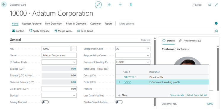 Tip: Select “show more” on General tab in Customer Card to see the Document Sending Profile